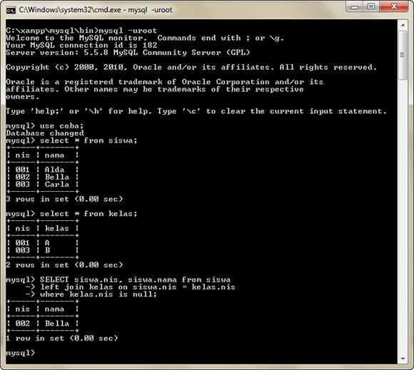 Ada 2 tabel. Tabel pertama berisi NIS dan nama siswa. Tabel ke dua berisi NIS dan kelas. Dia minta dibuatkan perintah SQL untuk menampilkan siswa yang belum mendapat kelas.