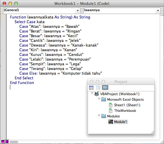 Anda pasti tahu kegunaan fungsi IF pada Microsoft Excel. Misalkan di kolom A berisi nama-nama kata dan di kolom B ingin dimunculkan lawan katanya. Kita bisa menulis fungsi seperti ini pada sel B2: =IF(A2="Atas", "Bawah", IF(A2="Besar", "Kecil", IF(A2="Kiri", "Kanan", "Komputer tidak tahu"))). Rumus pada sel B2 disebut berkedalaman 3 karena ada 3 IF di dalam IF. Ternyata, Microsoft Excel hanya mengizinkan IF sampai kedalaman 7. Bagaimana jika lebih dari 7? Kita harus membuat fungsi sendiri. Berikut ini saya tunjukkan caranya.